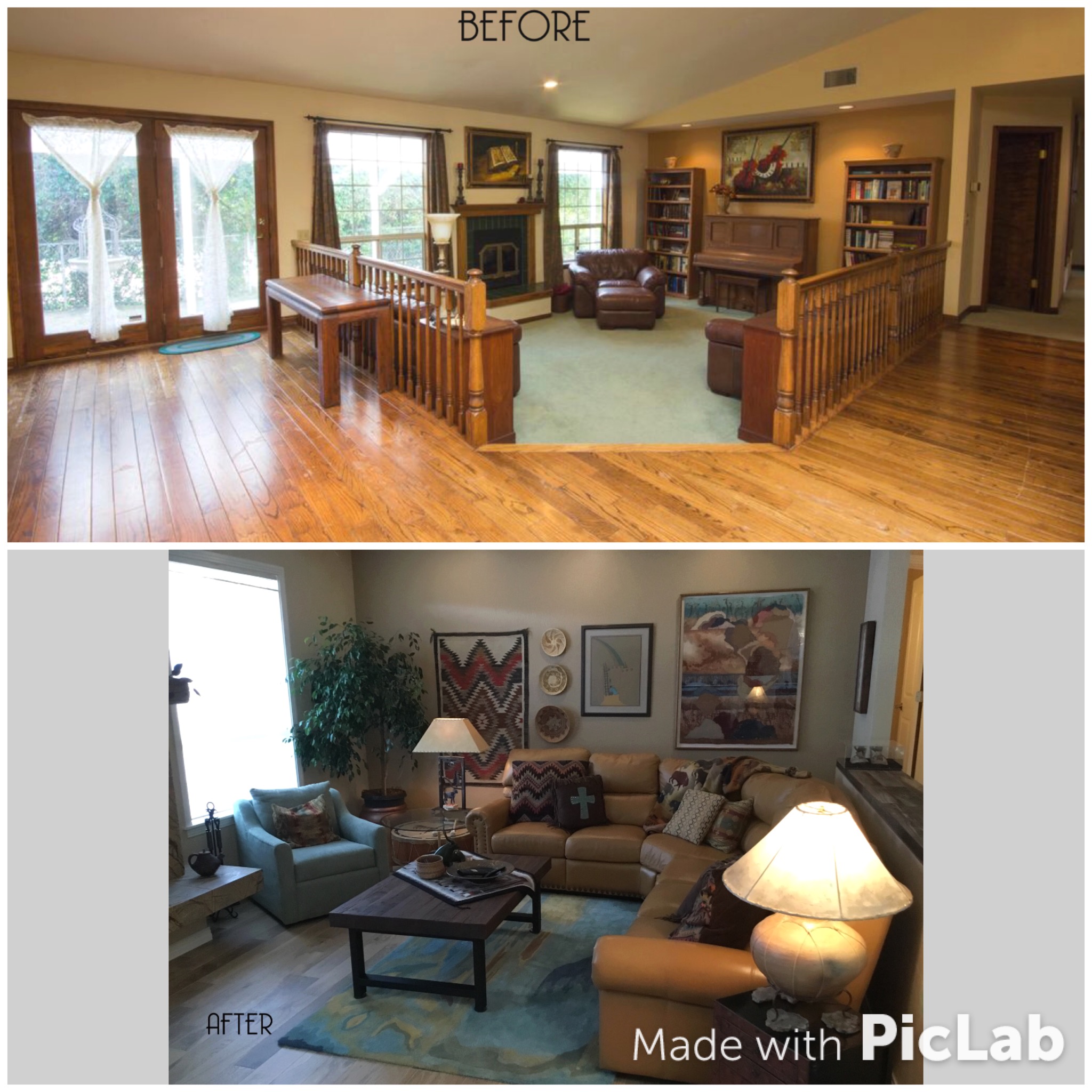 This home was purchased on Mt. Merritt with the intentions of a complete remodel. We removed the railing and added 5′ platform landing steps into the room. This client had lots of south west Navajo art she wanted to showcase so we made the back largest wall the focal point.