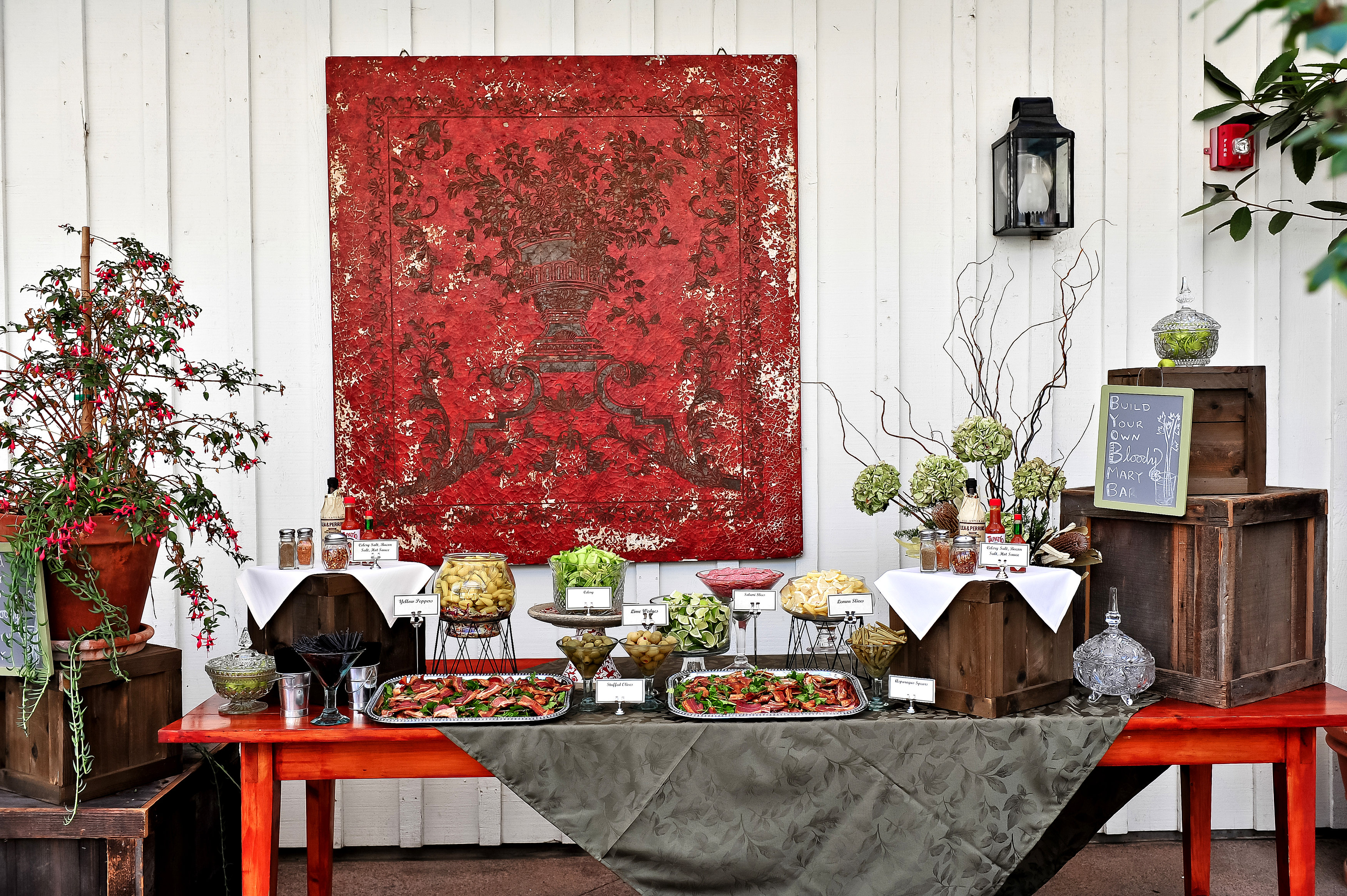 This clients daughter asked for a Bloody Mary Bar at her hotel wedding reception in San Diego.  We kept it organic and fun while incorporating nature with a mix of red elements.